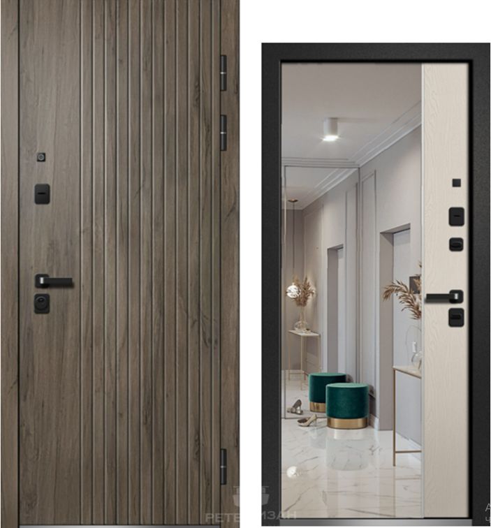 Зеркальная симфония в дубовых тонах. Дверь "Орфей-645" с зеркалом объединяет в себе великолепие натуральной текстуры дуба и практичность встроенного зеркала. Внешняя сторона "Дуб галифакс" создает статусный образ, а внутренняя панель "Форте каппучино" с зеркалом визуально расширяет прихожую и добавляет ей света. Толщина полотна 115 мм гарантирует сохранение тепла в самые суровые зимы.